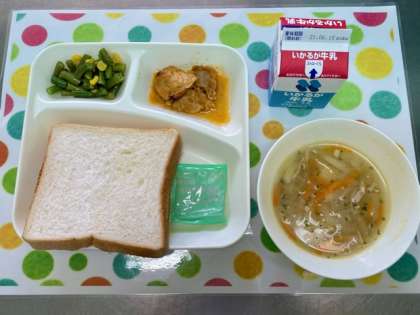 今日の給食は、けいにくのカレーマヨネーズ焼き・てぼ豆のスープ・さんどまめとコーンのサラダ・食パン・りんごジャム・牛乳です。