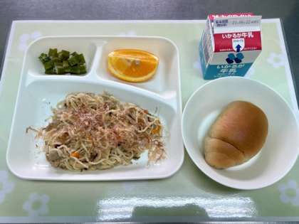 今日の給食は、和風焼きそば・オクラのあまず和え・オレンジ・黒糖1/2パン・牛乳です。