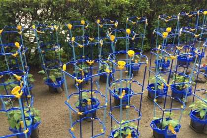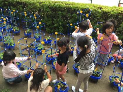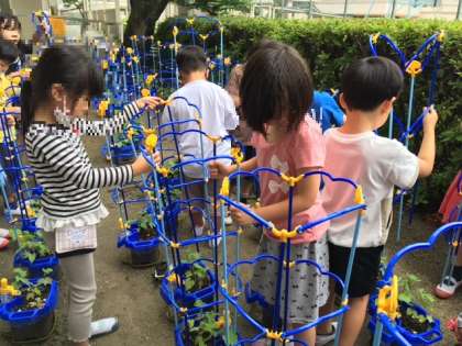 支柱が立った1年生のアサガオたち。夏休みを迎える頃にはいっぱい花をさかせていると思います。楽しみですね。