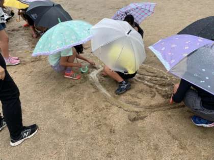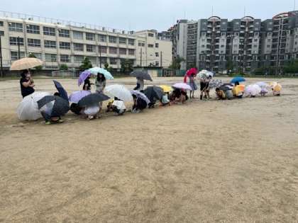 雨の中、4年生は運動場で流れる水の流れを観察しています。自分たちで水の流れを作ってみたり、もともとある水の流れを伸ばしてみたりして、水がどうやって流れるのか、流れる水が土をどう押し流していくのかを感じていました。