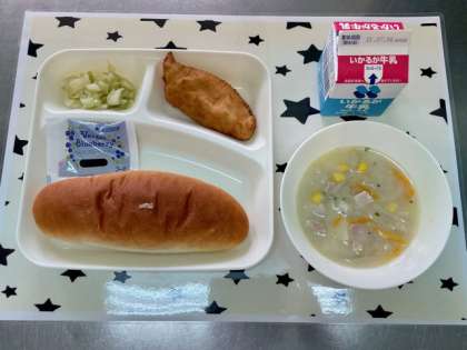 今日の給食は、サーモンフライ・豆乳スープ・キャベツのソテー・大型コッペパン・牛乳・ブルーベリージャムです。