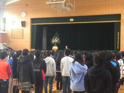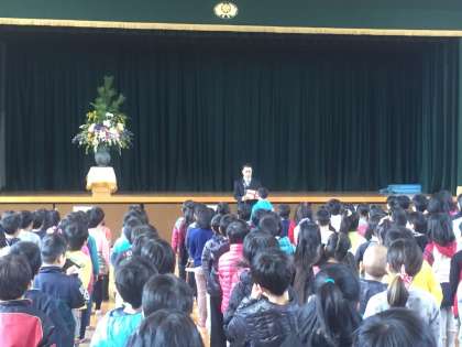 今日、今年度の修了式が講堂でありました。はじめに、校長先生から5年生の児童代表に通知表の授与があり、お話がありました。1年間を振り返ったお話や東井高野小学校の学校目標についてのお話でした。