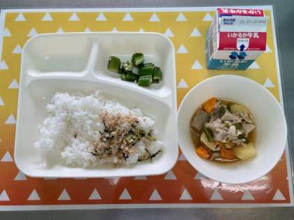 今日の給食は、ぶた肉とじゃがいもの煮もの・オクラの梅風味・ツナっぱいため・ごはん・牛乳です。