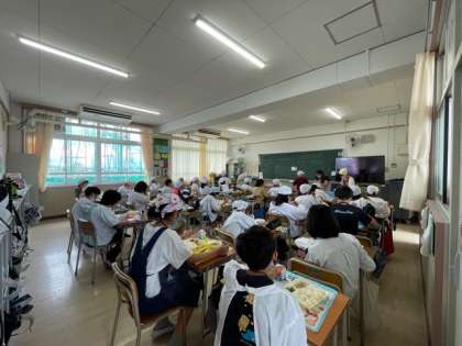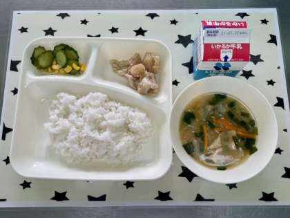 今日の給食は、けいにくのから揚げ・中華みそスープ・きゅうりとコーンの甘酢あえ・ごはん・牛乳です。