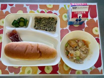 今日の給食は、もずく入りヒラヤーチー・ぶた肉とあつあげの煮もの・あっさりきゅうり・大型コッペパン・牛乳・いちごジャムです。
