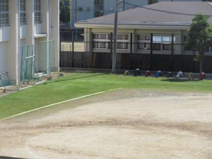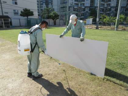 運動会準備のため、管理作業員のお二人が芝の整備を行いました。除草剤をまいて丁寧に芝を刈っています。