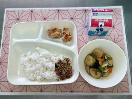 今日の給食は、鶏肉のたつたあげ・一口がんもとやさいの煮もの・おかかなっ葉・ごはん・牛乳です。