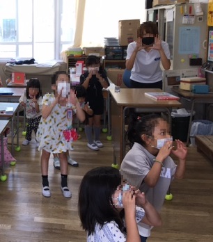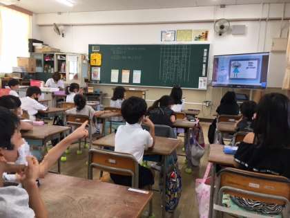 1年生の教室では、英語の楽しい音楽に合わせて動きをつけたり、英単語をおもしろいアニメーションを通して学んだりしていました。