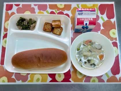 今日の給食は、はくさいのクリーム煮・あつあげのごまじょうゆかけ・豚肉と三度豆のオイスターソースいため・黒糖パン・牛乳です。