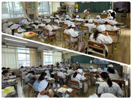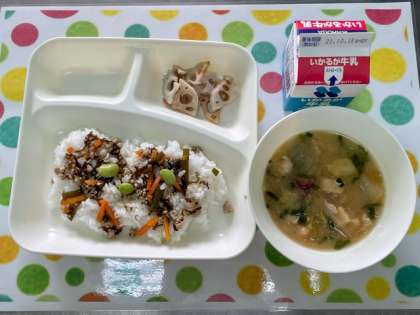今日の給食は、もずくと豚ひき肉のジューシー・さつまいものみそ汁・焼きれんこん・ごはん・牛乳です。