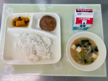 今日の給食は、和風ハンバーグ・とうふのみそ汁・かぼちゃのいとこ煮・ごはん・牛乳です。