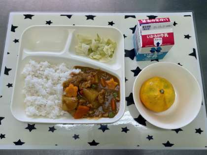 今日の給食は、ポークカレーライス【こめこ】・キャベツのピクルス・みかん・ごはん・牛乳です。