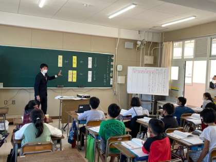 第1回目は4年2組の公開授業です。事前に研究部で練り上げた指導案を作成し、全教員が交互に授業を参観しました。
