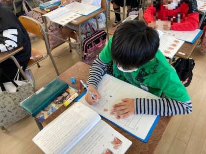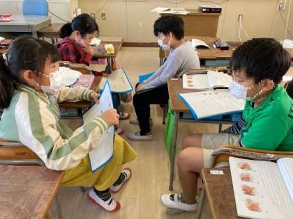 今回の授業では「ヤドカリとイソギンチャク」の読み取りや要約を交流することを通して、主体的・対話的な学習を行いました。