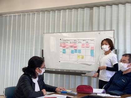 その後、グループに分かれ、当日の「指導案(教案)」をもとに、【成果】【課題】【質問】を話し合っていきます。【成果】はピンクの付箋紙、【課題】は青の付箋紙、【質問】は黄の付箋紙に書いて集約し、グループごとに発表していきます。