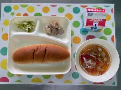 今日の給食は、鶏肉の香草焼き・ウインナーとてぼ豆のスープ・キャベツのガーリックソテー・黒糖パン・牛乳です。
