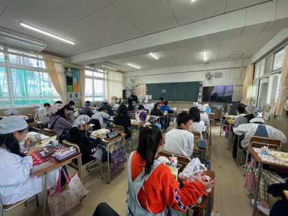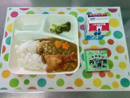 今日の給食は、えびフライカレーライス・ブロッコリーのサラダ・ソフト黒豆・ごはん・牛乳です。