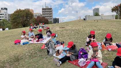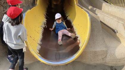 キッズプラザで遊んだ後は、扇町公園にでて外でお弁当を食べました。天気も良く、暖かい気候でした。お弁当を食べた後には、扇町公園の大きなすべり台で遊びました。いつもより大きなすべり台にみんなわくわくしていました。みんなで順番を守って楽しく遊ぶことができました。