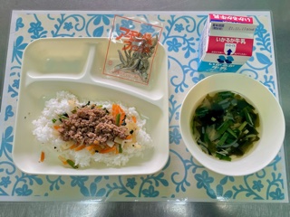 今日の給食は、ビビンバ・わかめスープ・アーモンドフィッシュ・ごはん・牛乳です。