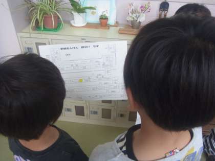 置いてあるシールを地図に貼って、仲良く学校内を探検しました。