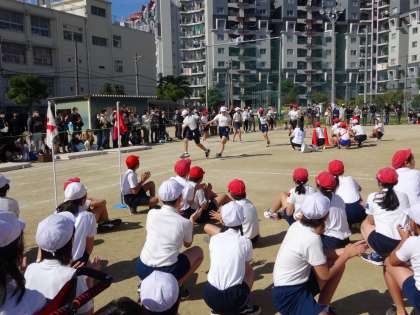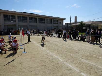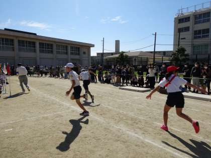 6年生のリレー「友と駆ける〜with〜未来へのバトン」です。子どもたちの繋がりを感じるリレーでした。小学校最後の運動会で精一杯駆けました。