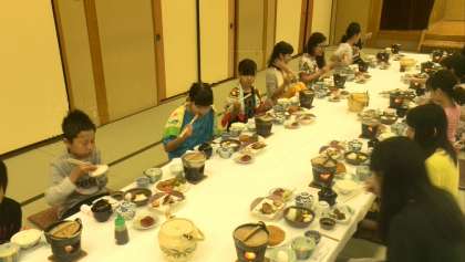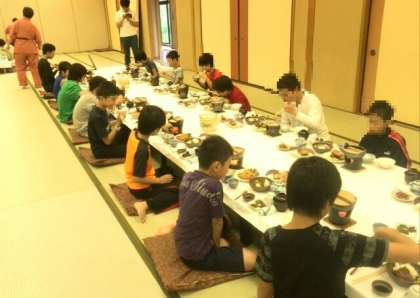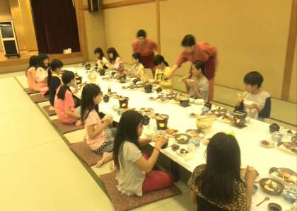 児童はホテルの料理にこれは何かと思いながら食べています。