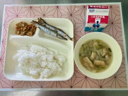 今日の給食は、焼きししゃも・五目汁・きんぴらごぼう・ごはん・牛乳です。
