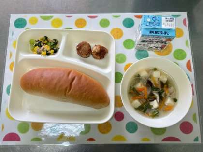 今日の給食は、揚げシューマイ・とうふのスープ・ツナとチンゲンサイのいためもの・黒糖パン・牛乳です。