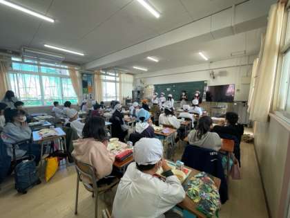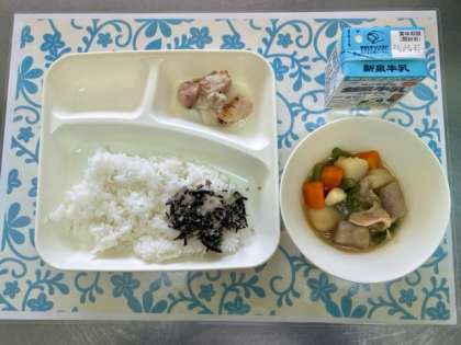 今日の給食は、鶏肉のゆず塩焼き・含め煮・魚ひじきそぼろ・ごはん・牛乳です。