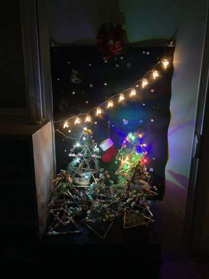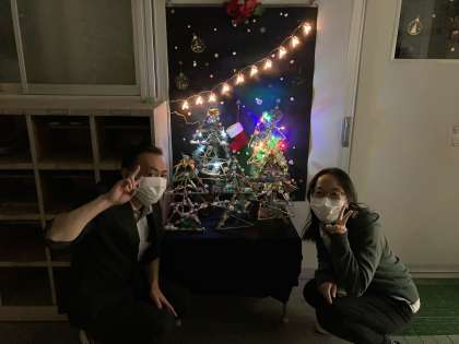 なかよしの児童たちがクリスマスの飾りとしてクリスマスツリーを作りました。それぞれが作ったものを重ね合わせて、ツリーのように見立てています。管理作業員さんたちが切り株を入れたり、ツリーのような葉っぱをいれたり、ライトをつけたりとたくさん手伝ってくださってより豪華なクリスマスの飾りが完成しました。