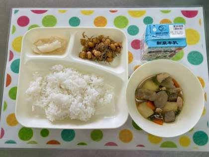 今日の給食は、鶏肉と野菜の煮もの・じゃこ豆・かぶのゆず風味・ごはん・牛乳です。