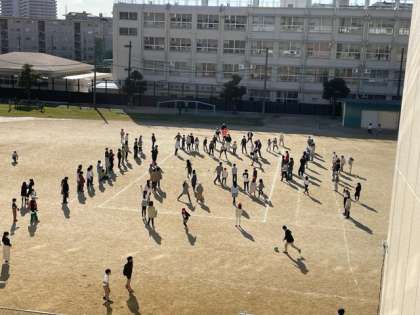 昼休みにドッジボール大会の決勝が行われました。試合に参加する人はもちろん、これまでに負けてしまった人も外に出て、勝負の行方を見守っています。どちらのチームも譲らず、高学年同士の激しいボールの投げ合いが続きましたが、先に6年生を当てた班が流れをつかみ、そのまま優勝しました。2学期の最後に、とても白熱する、すてきな大会でした。