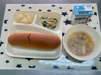 今日の給食は、マカロニグラタン・ウインナーのスープ・和なし(カット缶)・黒糖パン・牛乳です。