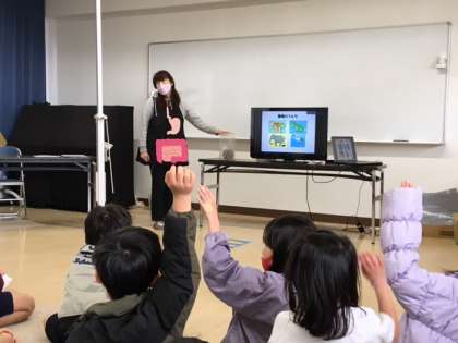 発育測定前に保健室の森本先生から保健指導がありました。早寝早起き、朝ごはん、毎朝の排便の大切さについての話の後、排便と食べたものや体調との関係をエプロンシアター形式の楽しいお話と映像でしっかり学びました。