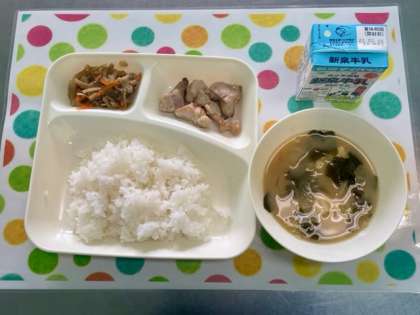 今日の給食は、鶏肉のしょうゆマヨネーズ焼き・みそ汁・きんぴらごぼう・ごはん・牛乳です。