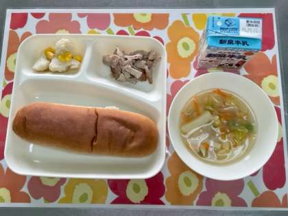 今日の給食は、豚肉のガーリック焼き・スープ・カリフラワーとコーンのサラダ・黒糖パン・牛乳です。