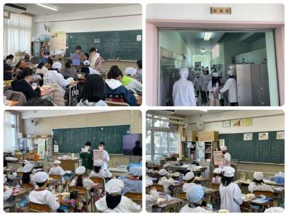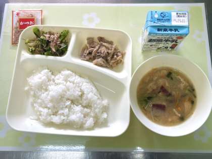 今日の給食は、豚肉のしょうが焼き・さつまいものみそ汁・菜の花のおひたし・ごはん・牛乳です。