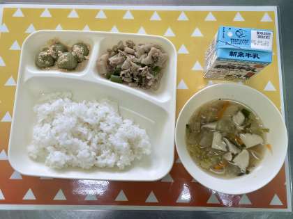 今日の給食は、豚肉とれんこんのいため煮・五目汁・きな粉よもぎだんご・ごはん・牛乳です。