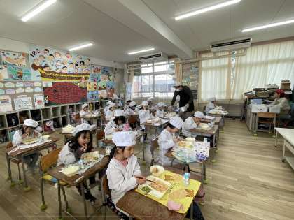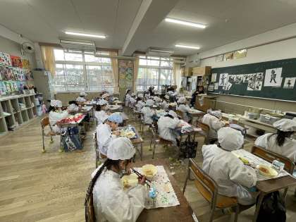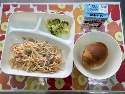今日の給食は、さけのクリームスパゲティ・キャベツときゅうりのサラダ・黒糖1/2クレセントパン・牛乳です。