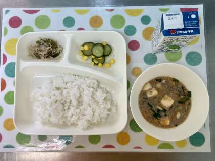 献立は、マーボー豆腐・きゅうりとコーンの甘酢和え・もやしとピーマンのごまいため・ごはん・牛乳です。