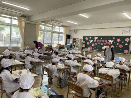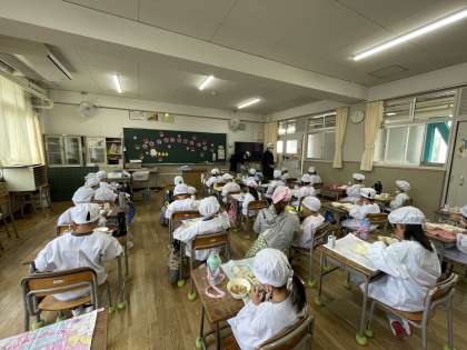 1年生は小学校に入学してから初めての給食でした。始めは、食べられるかなと不安や緊張をしていましたが、とてもよく食べている姿を見ることができました。中には、野菜や牛乳が苦手な児童も、一口だけ食べてみたりとがんばっていました。