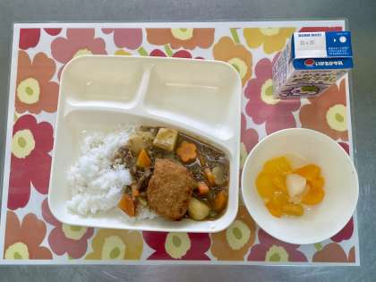 今日の献立は、1年生の入学をお祝いする献立のカツカレーライス・フルーツゼリー・ごはん・牛乳です。