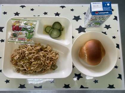 今日の献立は、焼きそば・きゅうりのしょうがづけ・豆こんぶ・黒糖1/2クレセントパン・牛乳です。