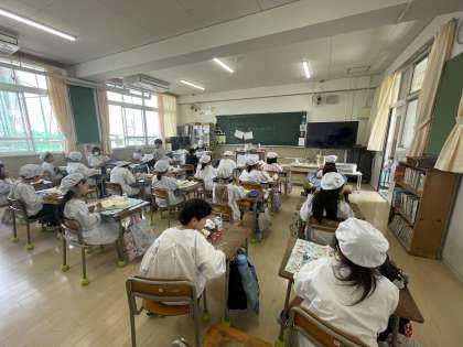 給食当番は、身支度や手洗いをすませ、見本をよく見て、丁寧に配膳しましょう。