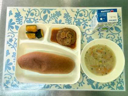 今日の献立は、煮込みハンバーグ・コーンとキャベツのスープ・焼きかぼちゃ・黒糖パン・牛乳です。