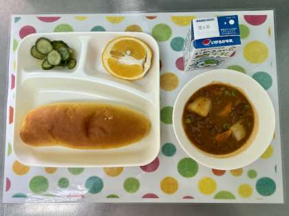 今日の献立は、ビーフシチュー・きゅうりのサラダ・あまなつかん・パンプキン・牛乳です。