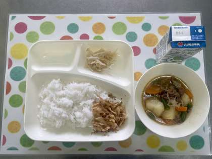 今日の献立は、肉じゃが・もやしのゆずの香和え・ごまかかいため・ごはん・牛乳です。