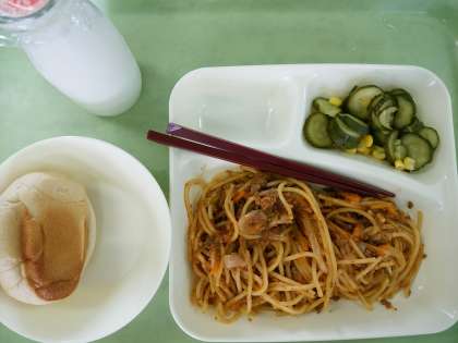 パン・牛乳・スパゲッティミートソース・きゅうりとコーンのピクルスです。