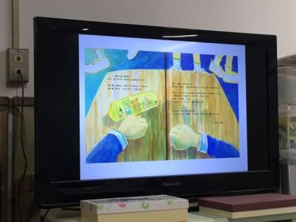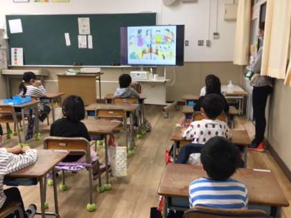 読み聞かせは「『あ・そ・ぼ』やで」というお話で、フランスの日本人学校から転校してきたユキちゃんが、からかってくるクラスメイトになじめず、「だれともはなさない」と心にきめてしまう話です。しかし、クラスで「そんなこと言うな」と声をあげてくれた男の子がいました。その子が帰り道「いっしょ『あ・そ・ぼ』というんやで」と教えてくれ、友だちになることができました。一歩を踏み出す大切さや、優しくできること、クラスの中で声を上げることの「カッコよさ」を感じる絵本です、