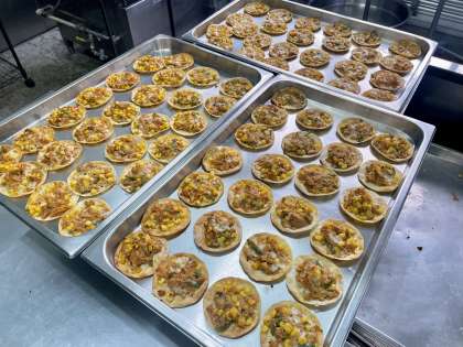 変わりピザは、餃子の皮にツナやコーン、チーズをのせてこんがり焼いたカリカリした食感の大人気の献立です。